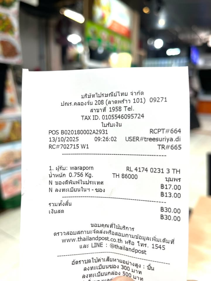 แจ้งเลขรหัสพัสดุ วันจันทร์ที่ 13 ตุลาคม 2568