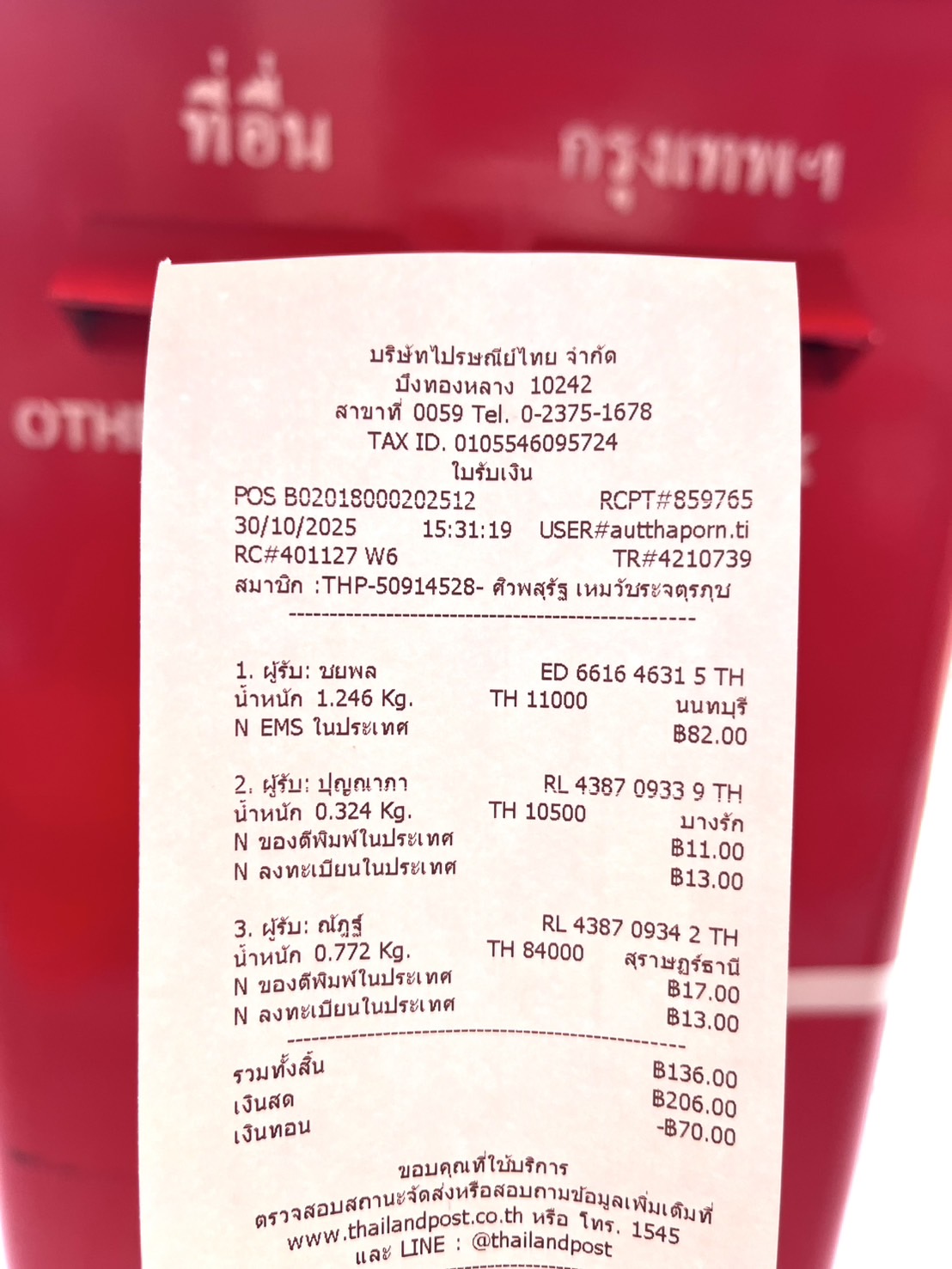 แจ้งเลขรหัสพัสดุ วันพฤหัสบดีที่ 30 ตุลาคม 2568
