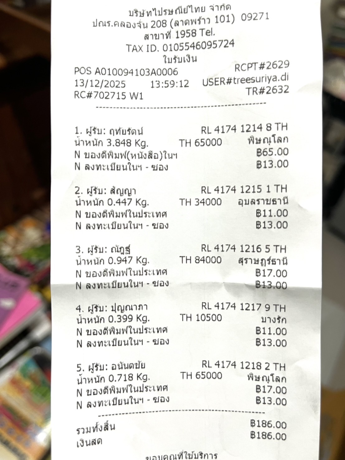 แจ้งเลขรหัสพัสดุ วันเสาร์ที่ 13 ธันวาคม 2568